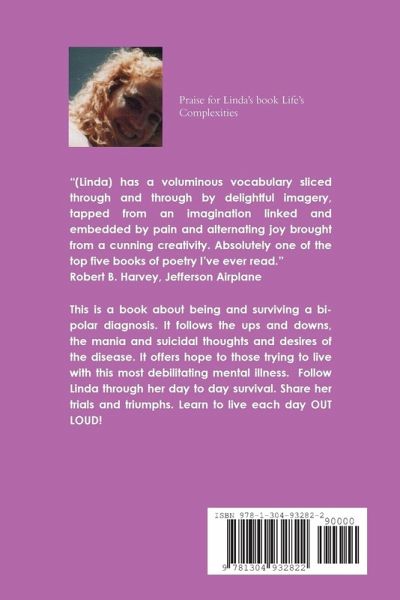 This is a book about being and surviving a bi-polar diagnosis. It follows the ups and downs, the mania and suicidal thoughts and desires of the disease. It offers hope to those trying to live with this most debilitating mental illness. Follow Linda through her day to day survival. Share her trials and triumphs. Learn to live each day OUT LOUD!