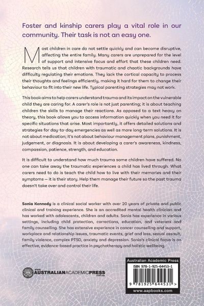 Foster and kinship carers play a vital role in our community. Their task is not an easy one. They are caring for vulnerable children who have come from complicated, often chaotic, backgrounds. As de facto parents, carers may experience family situations that can seem overwhelming in the face of a child's challenging behaviour. Most children in care do not settle quickly and can become disruptive, affecting the entire family. The underlying cause for most of this challenging, disruptive behaviour stems from the child's experience of early life trauma. Children with traumatic backgrounds have difficulty regulating their emotions. They lack the cortical capacity to efficiently process their thoughts and feelings, making it hard for them to change their behaviour to fit into their new life. Many carers are unprepared for the level of support, intensive focus, and effort these children need. Typical parenting strategies may not work. That's why Sonia Kennedy wrote Healing Trauma in Children as a practical guide. Sonia is an Australian clinical social worker who has spent over 20 years working with adults and children treating post-trauma stress reactions, complex PTSD, anxiety and depression in various community settings, including child protection, corrections, and family counselling. She has seen firsthand how hard it is for even experienced and committed foster and kinship carers to cope with the behavioural effects of childhood trauma exhibited by those placed in their loving care. She knows that foster and kinship carers need easy-to-access answers for everyday issues. Unlike a text heavy on theory, her book allows the reader to access information quickly when needed. Most importantly, it offers detailed strategies for day-to-day emergencies and long-term solutions. It is not about medication; it's not about behaviour management plans, punishment, judgement, or diagnosis. It is about developing a carer's awareness, kindness, compassion, patience, strength, and education. Healing Trauma aims to help carers understand trauma and its impact on the vulnerable child they are caring for; to help that child manage their future so the past trauma doesn't take over and control their life. Issues covered include: ¿ Sleep ¿ Calm down strategies for emotions ¿ Anger ¿ Anxiety ¿ Withdrawal and Sadness ¿ Social skills ¿ Attachment ¿ Family contact ¿ Toilet issues ¿ Eating habits ¿ Lying and stealing ¿ Sexualised behaviour ¿ Boundaries and routines ¿ Diet ¿ Hygiene ¿ Healthy relationships ¿ Self-esteem ¿ Identity and culture