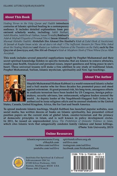 Compiled by world-renowned Islamic scholar and Sufi master Shaykh Muhammad Hisham Kabbani, "Healing Verses in the Holy Quran and Hadith" introduces centuries of Islamic spiritual healing to a contemporary audience. It includes detailed explanations from preeminent scholarly works, including: Sahih Bukhari, Sahih Muslim, Sahih Ibn al-Habban, Sunan Tirmidhi; Bukhari's "Adab al-Mufrad" (Etiquette of Personal Ethics);Imam Ahmad's "Musnad" (Reliable Hadith); Abdullah Ibn Ahmad Ibn Hanbal's "Kitab al-Zuhd" (Book of Asceticism; "Al-Jawaab al-Kaafee liman sa'ala `ala ad-daw`a ish-shafi`I" (The Sufficient Answers for Those Who Asked about the Healing Medicine), and "Madarij as-Salikeen" (Stations of the Travelers on the Path), each by Ibn Qayyim al-Jawziyya; and, Ibn Abi ad-Dunya's "Kitab al-Mujabeen" (Book of Those Whose Du`as Allah Accepted). This work includes several powerful supplications taught by Prophet Muhammad and their secret spiritual knowledge hidden in specific formulas that are known to remove obstacles, resolve poor health, financial and personal issues, impart goodness and bring peace to one's heart. These universal lessons will make a fine addition to any study of traditional Islam, Prophet Muhammad, Sufism, Islamic mysticism, spirituality and New Age teachings.
