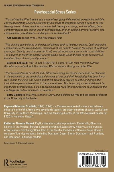 Raymond Monsour Scurfield, DSW, LCSW, is a Vietnam veteran who was a social work officer on one of the Army's two psychiatric teams, professor emeritus of social work at the University of Southern Mississippi, and the founding director of the VA's National Center for PTSD in Honolulu, Hawai'i. Katherine Theresa Platoni, PsyD, maintains a private practice in Centerville, Ohio, is a colonel in the Medical Service Corps of the United States Army Reserve, and serves as Army Reserve Psychology Consultant to the Chief in the Medical Service Corps. She is a veteran of four deployments, including Operation Desert Storm, Operation Iraqi Freedom, and Operation Enduring Freedom.