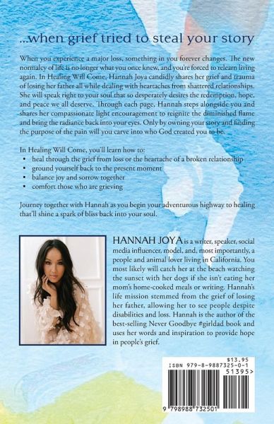 ...when grief tried to steal your story When you experience a major loss, something in you forever changes. The new normalcy of life is no longer what you once knew, and you're forced to relearn living again. In Healing Will Come, Hannah Joya candidly shares her grief and trauma of losing her father all while dealing with heartaches from shattered relationships. She will speak right to your soul that so desperately desires the redemption, hope, and peace we all deserve. Through each page, Hannah steps alongside you and shares her compassionate light encouragement to reignite the diminished flame and bring the radiance back into your eyes. Only by owning your story and finding the purpose of the pain will you carve into who God created you to be. In Healing Will Come, you'll learn how to:· heal through the grief from loss or the heartache of a broken relationship· ground yourself back to the present moment · balance joy and sorrow together · comfort those who are grieving Journey together with Hannah as you begin your adventurous highway to healing that'll shine a spark of bliss back into your soul.
