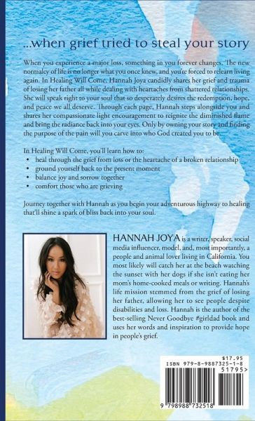...when grief tried to steal your story When you experience a major loss, something in you forever changes. The new normalcy of life is no longer what you once knew, and you're forced to relearn living again. In Healing Will Come, Hannah Joya candidly shares her grief and trauma of losing her father all while dealing with heartaches from shattered relationships. She will speak right to your soul that so desperately desires the redemption, hope, and peace we all deserve. Through each page, Hannah steps alongside you and shares her compassionate light encouragement to reignite the diminished flame and bring the radiance back into your eyes. Only by owning your story and finding the purpose of the pain will you carve into who God created you to be. In Healing Will Come, you'll learn how to: · heal through the grief from loss or the heartache of a broken relationship · ground yourself back to the present moment · balance joy and sorrow together · comfort those who are grieving Journey together with Hannah as you begin your adventurous highway to healing that'll shine a spark of bliss back into your soul. Hannah Joya is a writer, speaker, social media influencer, model, and, most importantly, a people and animal lover living in California. You most likely will catch her at the beach watching the sunset with her dogs if she isn't eating her mom's home-cooked meals or writing. Hannah's life mission stemmed from the grief of losing her father, allowing her to see people despite disabilities and loss. Hannah is the author of the best-selling Never Goodbye #girldad book and uses her words and inspiration to provide hope in people's grief.