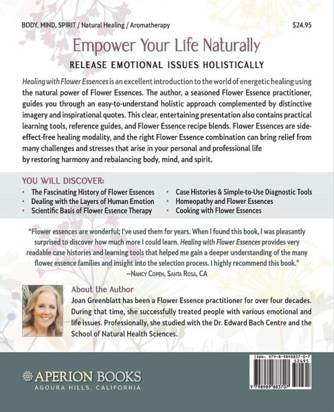 REVISED AND EXPANDED SECOND EDITION ¿Healing with Flower Essences is an excellent introduction to the world of energetic healing using the natural power of Flower Essences. The author, a seasoned Flower Essence practitioner, guides you through an easy-to-understand holistic approach complemented by distinctive imagery and inspirational quotes. This clear, entertaining presentation also contains practical learning tools, reference guides, and Flower Essence recipe blends. Flower Essences are side-effect-free healing modality, and the right Flower Essence combination can bring relief from many challenges and stresses that arise in your personal and professional life by restoring harmony and re-balancing body, mind, and spirit. Discover Flower Essences Through: ¿ The Fascinating History of Flower Essences ¿ Dealing with the Layers of Human Emotion ¿ Scientific Basis of Flower Essence Therapy ¿ Case Histories & Simple-to-Use Diagnostic Tools ¿ Homeopathy and Flower Essences ¿ Cooking with Flower Essences