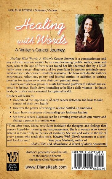 Healing With Words: A Writer's Cancer Journey is a compassionate and wry self-help memoir written by an award-winning prolific author, nurse and poet, who at the age of forty-seven found her life shattered first by a DCIS (early breast cancer) diagnosis and five years later by another, seemingly unrelated and incurable cancer--multiple myeloma. The book includes the author's experiences, reflections, poetry and journal entries, in addition to writing prompts for readers to express their own personal story. Raab's journals have provided a safe haven and platform to validate and express her feelings. Raab views journaling to be like a daily vitamin--in that it heals, detoxifies and is essential for optimal health. Readers will learn to: Understand the importance of early cancer detection and how to take control of their own health Discover the power of writing to release bottled-up emotions Learn how the process of journaling can facilitate healing See how a cancer diagnosis can be a riveting event which can renew and change a person in a unique way Praise for Raab's Healing With Words: "One woman's story, beautifully told and inspiring to those for whom journaling will ease a cancer diagnosis." --Barbara Delinsky, author UPLIFT: Secrets from the Sisterhood of Breast Cancer Survivors "Time after time, Diana articulates incisively the thoughts and feelings that convey hoped-for meaning and encouragement. She is a woman who knows what it is to live fully in the face of mortality. She will add value to the life of every person who reads this book. Healing With Words resonates at a spiritual level for me." --Sena Jeter Naslund, author of Ahab's Wife and Abundance: A Novel of Marie Antoinette Author's proceeds from the sale of this book donated to benefit the Mayo Clinic Foundation Learn more at www.DianaRaab.com Another inspirational book from Loving Healing Press www.LovingHealing.com HEA039031 Health & Fitness : Diseases - Breast Cancer SEL501000 Self-Help : Journal Writing MED058160 Nursing - Oncology & Cancer