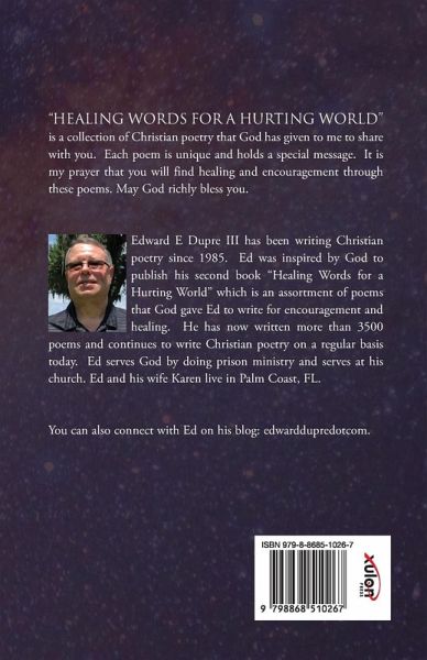 "Healing Words for a Hurting World" is a collection of Christian poetry that God has given to me to share with you. Each poem is unique and holds a special message. It is my prayer that you will find healing and encouragement through these poems. May God richly bless you. Edward E Dupre III has been writing Christian poetry since 1985. Ed was inspired by God to publish his second book "Healing Words for a Hurting World" which is an assortment of poems that God gave Ed to write for encouragement and healing. He has now written more than 3500 poems and continues to write Christian poetry on a regular basis today. Ed serves God by doing prison ministry and serves at his church. Ed and his wife Karen live in Palm Coast, FL. You can also connect with Ed on his blog: edwarddupredotcom.