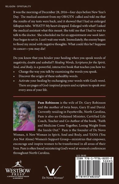 It was the morning of December 28, 2016-four days before New Year's Day. The medical assistant from my OB/GYN called and told me that the results of my tests were back, and it showed that I had an enlarged fallopian tube. WHAT!?! My heart dropped. Enlarged with what? I asked the medical assistant what this meant. She told me that I had to wait to talk to the doctor. She scheduled me for an appointment one week later. Fear began to set in. I can't wait one week. Immediately, the enemy began to flood my mind with negative thoughts. What could this be? Suppose its cancer-you may die! Do you know that you hinder your healing when you speak words of negativity, doubt and unbelief? Healing Words, Scriptures for the Spirit, Soul, and Body, is a powerful, interactive book that teaches you how to: ¿ Change the way you talk by examining the words you speak. ¿ Discover the origin of these unhealthy words. ¿ Activate your healing by exchanging your words with God's word. There are pages of God-inspired prayers and scripture to speak over every area of your life.