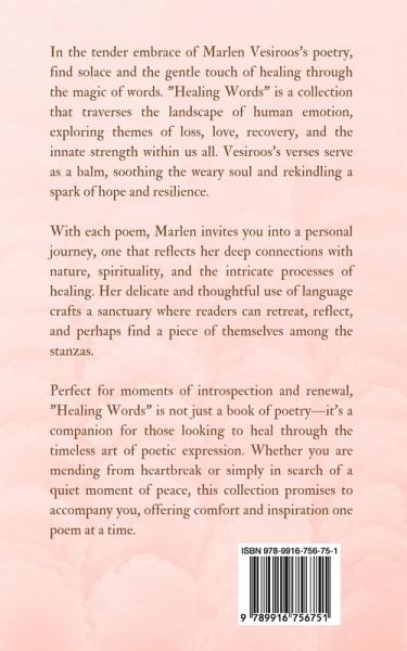 In the tender embrace of Marlen Vesiroos's poetry, find solace and the gentle touch of healing through the magic of words. "Healing Words" is a collection that traverses the landscape of human emotion, exploring themes of loss, love, recovery, and the innate strength within us all. Vesiroos's verses serve as a balm, soothing the weary soul and rekindling a spark of hope and resilience. With each poem, Marlen invites you into a personal journey, one that reflects her deep connections with nature, spirituality, and the intricate processes of healing. Her delicate and thoughtful use of language crafts a sanctuary where readers can retreat, reflect, and perhaps find a piece of themselves among the stanzas. Perfect for moments of introspection and renewal, "Healing Words" is not just a book of poetry-it's a companion for those looking to heal through the timeless art of poetic expression. Whether you are mending from heartbreak or simply in search of a quiet moment of peace, this collection promises to accompany you, offering comfort and inspiration one poem at a time. Copyright © 2024 Book Fairy Publishing