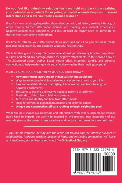 Do you feel like unhealthy relationships have held you back from realizing your potential as an adult? Do negative, unhealed wounds shape your current interactions and leave you feeling misunderstood? Many women don't have secure attachment styles, which impacts adult behavior. By identifying and addressing attachment scars, we can more authentically improve the way we develop positive relationships in life. If you're a woman struggling with codependent behavior, addiction, anxiety, intimacy, or other trauma, former attachment wounds are molding your current experiences. Negative attachments, obsessions, and lack of trust no longer need to dominate or destroy your connections with others. It's time to reframe your attachment styles once and for all so you can heal, create personal independence, and establish successful relationships. With a thorough examination and understanding of attachment, you can learn to more genuinely bridge a healthy relationship between yourself and others. We build strong and thriving interpersonal relationships by learning how to comprehend our past and mend any damage caused by negative attachments. In this second book of The Sisterhood Series, author Boadi Moore offers insightful, candid, and personal connections to help readers quickly and effectively realize their healing potential. Inside Healing Your Attachment Wounds, you'll discover: How attachment styles impact individuals far into adulthood Ways to understand which attachment styles connect most to your life Raw and relatable stories that highlight how women can learn to let go of negative attachments Strategies to explore and resolve negative parental attachment Methods to detach from childhood trauma Techniques to identify and heal toxic attachments Ideas for reframing personal boundaries and communication Unique and constructive self-care routines to begin celebrating you! Plus, you'll receive ideas for sharing your story of attachment and healing. Neuroscientists and doctors are making society more and more aware of the undeniable connection between the mind, spirit, and body—which are holistically integrated parts of our whole being. Doctors Gabor Maté, Amir Levine, and Bessel van der Kolk are but a few of the prominent names who advocate this integrative mind-body system. While the past shapes our behaviors and interactions with others, attachment wounds don't have to impede our ability to succeed in the present. True integration of our wounds gives us the power to embrace love and nurture the connections we hold dear. "Exquisite masterpiece, delving into the realms of trauma and the intricate nuances of relationships. An invaluable companion offering profound wisdom. A beacon of hope for those seeking solace and transformation. This book will captivate readers with its evocative language, leaving an indelible imprint on their hearts and minds." ~ Onlinebookclub.org