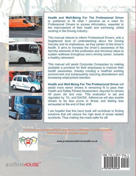 Health And Well-Being For The Professional Driver is published to fill what I perceive to be a need for Professional Drivers to access information, essential to the improvement of their health and well-being, while working in the Driving Industry. This manual intends to generate informed Professional Drivers, with a heightened level of understanding about the driving industry and its implications, as they pertain to the Driver's health. It aims to increase the Driver's awareness of the harmful elements of this profession and introduce steps to sustain wellness throughout one's driving career, toward a healthy retirement. The book will assist Corporate Companies by making available a provision for their employees to improve their health awareness, thereby creating a healthier work environment and subsequently reducing absenteeism and increasing employment retention. Health And Well-Being For The Professional Driver will assist more senior Drivers in remaining fit, to pass their Health and Safety Fitness Assessment, required for drivers 45 years old and over. This evaluation is set and regulated by (TfL) and (DVLA). Adherence will also enable drivers to be less prone to illness and feeling less exhausted at the end of their shift. I am hopeful that this hand book will contribute to finding solutions that will reduce the high level of stress related accidents. Thus making the roads safer for all!
