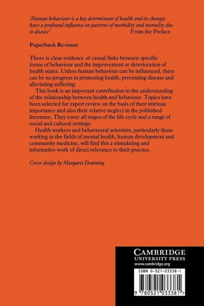 There is clear evidence of causal links between specific forms of behaviour and the improvement or deterioration of health states. Unless human behaviour can be influenced, there can be no progress in promoting health, preventing disease and alleviating suffering. This book is an important contribution to the understanding of the relationship between health and behaviour. Topics have been selected for expert review on the basis of their intrinsic importance and also their relative neglect in the published literature. They cover all stages of the life cycle and a range of social and cultural settings. Health workers and behavioural scientists, particularly those working in the fields of mental health, human development and community medicine, will find this a stimulating and informative work of direct relevance to their practice.