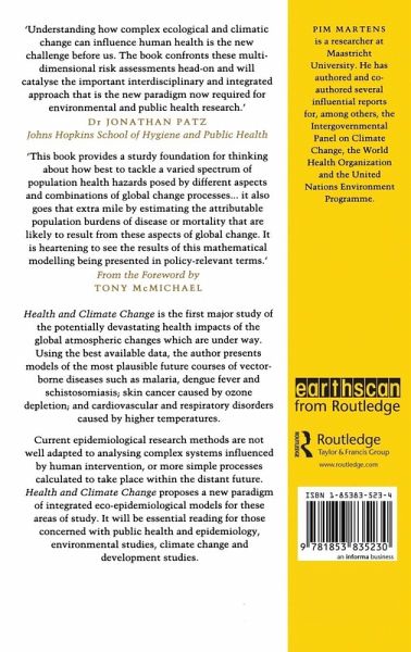 List of Acronyms and Abbreviations List of Figures List of Tables List of Boxes Foreword by Tony McMichael Preface 1. Introduction The Issue Scope and Objectives Outline 2. An Eco-Epidemiological Modelling Approach Introduction Limitations of Conventional Epidemiology Eco-Epidemiological Modelling Discussion 3. Climate Change and Vector-Borne Diseases Introduction The Vectors and Their Diseases Epidemic Potential Climate Effects Malaria Prevalence Climate Scenarios Changes in Potential Risk Areas Changes in Malaria Prevalence Local Estimates: Model Validation Model Limitations and Uncertainties Discussion and Conclusions 4. Modelling Malaria as a Complex Adaptive System Introduction The Genetic Algorithm Modelling Adaptation by Genetic Algorithms Modelling Experiments Discussion and Conclusions 5. Climate Change, Thermal Stress and Morality Changes Introduction Health Impact Assessment Thermal Stress in a Number of Cities Cardiovascular Mortality and Sensitivity to Adaptation Discussion and Conclusions 6. The Impact of Ozone Depletion on Skin Cancer Incidence Introduction Modelling the Cause-Effect Chain Ozone Depletion and Skin Cancer Risk in the Netherlands and Australia Uncertainties Discussion and Conclusions 7. Discussion and Conclusions Introduction Major Findings Future Research lines Epilogue References Index