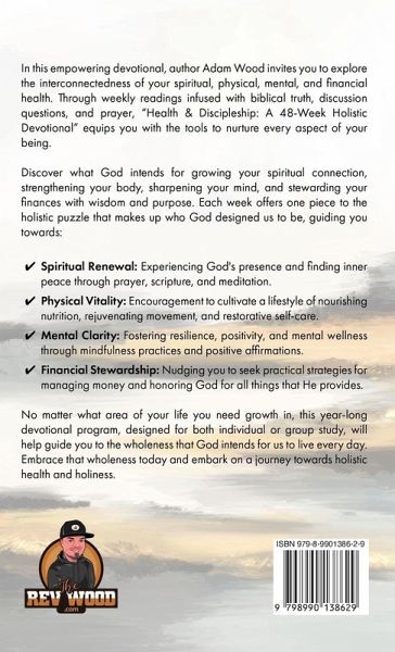 In this empowering devotional, author Adam Wood invites you to explore the interconnectedness of your spiritual, physical, mental, and financial health. Through weekly readings infused with biblical truth, discussion questions, and prayer, "Health & Discipleship: A 48-Week Holistic Devotional" equips you with the tools to nurture every aspect of your being. Discover what God intends for growing your spiritual connection, strengthening your body, sharpening your mind, and stewarding your finances with wisdom and purpose. Each week offers one piece to the holistic puzzle that makes up who God designed us to be, guiding you towards: Spiritual Renewal: Experiencing God's presence and finding inner peace through prayer, scripture, and meditation. Physical Vitality: Encouragement to cultivate a lifestyle of nourishing nutrition, rejuvenating movement, and restorative self-care. Mental Clarity: Fostering resilience, positivity, and mental wellness through mindfulness practices and positive affirmations. Financial Stewardship: Nudging you to seek practical strategies for managing money and honoring God for all things that He provides. No matter what area of your life you need growth in, this year-long devotional program, designed for both individual or group study, will help guide you to the wholeness that God intends for us to live every day. Embrace that wholeness today and embark on a journey towards holistic health and holiness.