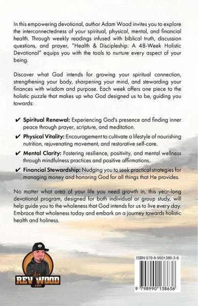 In this empowering devotional, author Adam Wood invites you to explore the interconnectedness of your spiritual, physical, mental, and financial health. Through weekly readings infused with biblical truth, discussion questions, and prayer, "Health & Discipleship: A 48-Week Holistic Devotional" equips you with the tools to nurture every aspect of your being. Discover what God intends for growing your spiritual connection, strengthening your body, sharpening your mind, and stewarding your finances with wisdom and purpose. Each week offers one piece to the holistic puzzle that makes up who God designed us to be, guiding you towards: Spiritual Renewal: Experiencing God's presence and finding inner peace through prayer, scripture, and meditation. Physical Vitality: Encouragement to cultivate a lifestyle of nourishing nutrition, rejuvenating movement, and restorative self-care. Mental Clarity: Fostering resilience, positivity, and mental wellness through mindfulness practices and positive affirmations. Financial Stewardship: Nudging you to seek practical strategies for managing money and honoring God for all things that He provides. No matter what area of your life you need growth in, this year-long devotional program, designed for both individual or group study, will help guide you to the wholeness that God intends for us to live every day. Embrace that wholeness today and embark on a journey towards holistic health and holiness.