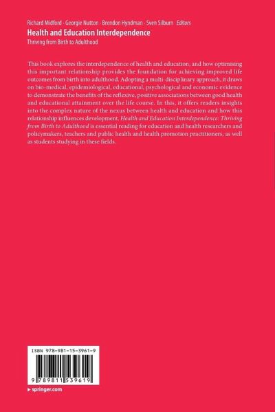 This book explores the interdependence of health and education, and how optimising this important relationship provides the foundation for achieving improved life outcomes from birth into adulthood. Adopting a multi-disciplinary approach, it draws on bio-medical, epidemiological, educational, psychological and economic evidence to demonstrate the benefits of the reflexive, positive associations between good health and educational attainment over the life course. In this, it offers readers insights into the complex nature of the nexus between health and education and how this relationship influences development. Health and Education Interdependence: Thriving from Birth to Adulthood is essential reading for education and health researchers and policymakers, teachers and public health and health promotion practitioners, as well as students studying in these fields.