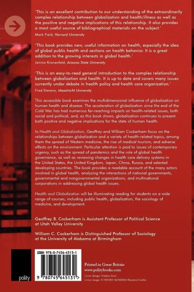 This accessible book examines the multidimensional influence of globalization on human health and disease. The acceleration of globalization since the end of the Cold War has had numerous far-reaching impacts on health-related issues, both social and political, and as this book shows, globalization continues to present both positive and negative implications for the state of human health. Geoffrey and William Cockerham focus on the relationships between globalization and a variety of health-related topics including the spread of Western medicine, the rise of medical tourism, and adverse effects on the environment. Particular attention is paid to issues of contemporary urgency such as the spread of pandemics and the role of global health governance. The book provides a readable account of the many actors involved in global health, analyzing the interactions of national governments, governmental and nongovernmental organizations, and multinational corporations in addressing global health issues. Health and Globalization will be illuminating reading for students on a wide range of courses including public health, globalization, the sociology of medicine, and development.