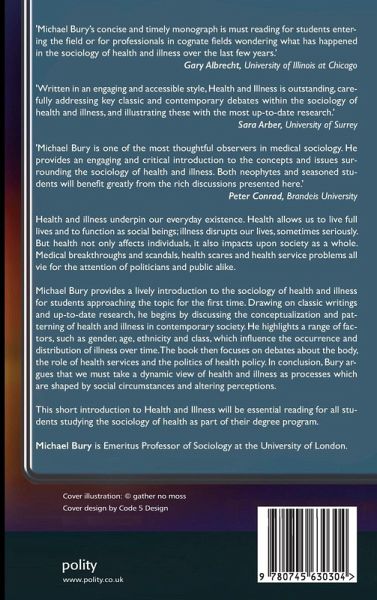 Health and illness underpin our everyday existence. Health allows us to live full lives and to function as social beings; illness disrupts our lives, sometimes seriously. But health not only affects individuals, it also impacts upon society as a whole. Medical breakthroughs and scandals, health scares and health service problems all vie for the attention of politicians and public alike. Michael Bury provides a lively introduction to the sociology of health and illness for students approaching the topic for the first time. Drawing on classic writings and up-to-date research, he discusses the conceptualization and patterning of health and illness in contemporary society. He highlights a range of factors, such as gender, age, ethnicity and class, which influence the occurrence and distribution of illness over time. The book then focuses on debates about the body, the role of health services and the politics of health policy. In conclusion, Bury argues that we must take a dynamic view of health and illness as processes that are shaped by social circumstances and altering perceptions. This short introduction will be essential reading for all students studying the sociology of health as part of their degree programme.