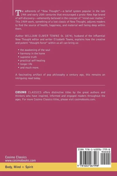 The adherents of "New Thought"-a belief system popular in the late 19th and early 20th centuries that encouraged a proto-New Age brand of self-discovery-vehemently believed in the concept of "mind over matter." This 1909 work, something of a lost classic of New Thought, adjures readers to find the source of health, happiness, and material well being deep within them. Author WILLIAM ELMER TOWNE (b. 1874), husband of the influential New Thought editor and writer Elizabeth Towne, explains how the creative and potent "thought-force" within us all can bring us: . the awakening of the soul . harmony in the home . supreme truth . practical self-healing . longer life . and much more. A fascinating artifact of pop philosophy a century ago, this remains an intriguing read today.