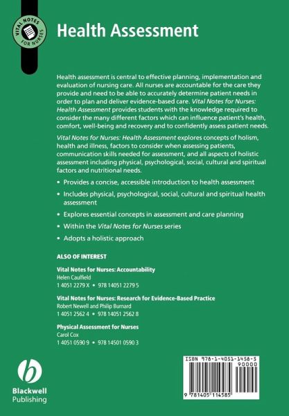 Health assessment is central to effective planning, implementation and evaluation of nursing care. All nurses are accountable for the care they provide and need to be able to accurately determine patient needs in order to plan and deliver evidence-based care. Vital notes for nurses: Health assessment provides students with the knowledge required to consider the many different factors which can influence patient's health, comfort, well-being and recovery and to confidently assess patient needs. Vital notes for nurses: Health assessment explores concepts of holism, health and illness, factorsto consider when assessing patients, communication skills needed for assessment, and all aspects of holistic assessment including physical, psychological, social, cultural and spiritual factors and nutritional needs.