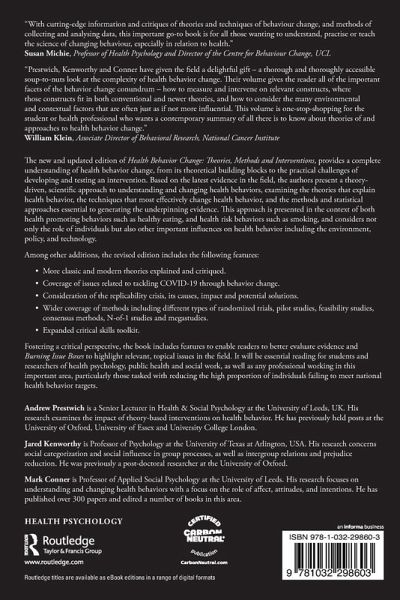 The new and updated edition of Health Behavior Change: Theories, Methods and Interventions, provides a complete understanding of health behavior change, from its theoretical building blocks to the practical challenges of developing and testing an intervention. Based on the latest evidence in the field, the authors present a theory-driven, scientific approach to understanding and changing health behaviors, examining the theories that explain health behavior, the techniques that most effectively change health behavior, and the methods and statistical approaches essential to generating the underpinning evidence. This approach is presented in the context of both health promoting behaviors such as healthy eating, and health risk behaviors such as smoking, and considers not only the role of individuals but also other important influences on health behavior including the environment, policy, and technology.