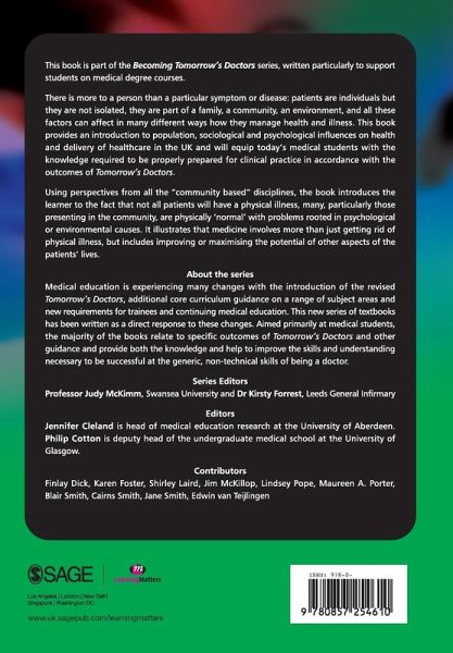 There is more to a person than a particular symptom or disease: patients are individuals but they are not isolated, they are part of a family, a community, an environment, and all these factors can affect in many different ways how they manage health and illness. This book provides an introduction to population, sociological and psychological influences on health and delivery of healthcare in the UK and will equip today s medical students with the knowledge required to be properly prepared for clinical practice in accordance with the outcomes of Tomorrow s Doctors.