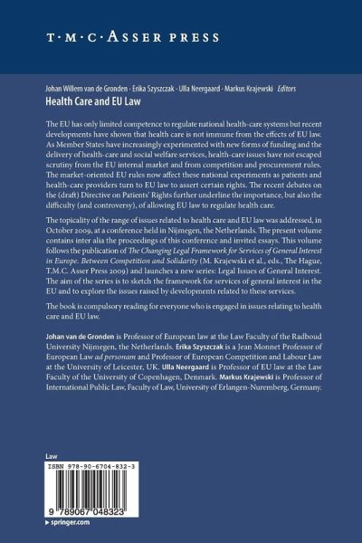 The topicality of the range of issues related to health care and EU law was addressed, in October 2009, at a conference held in Nijmegen, The Netherlands. The present volume contains inter alia the proceedings of this conference and invited essays. This volume follows the publication of The Changing Legal Framework for Services of General Interest in Europe. Between Competition and Solidarity (Krajewski M et al (eds) (2009) T.M.C. Asser Press, The Hague) and launches a new series: Legal Issues of Services of General Interest. The aim of the series is to sketch the framework for services of general interest in the EU and to explore the issues raised by developments related to these services.