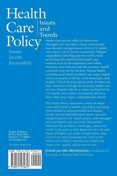This book offers a systematic review of major issues and trends in health care policy, including those related to physical health and disease trends, mental and behavioral health concerns, reorganizing the U.S. health system, and managed care and health care personnel. Kronenfeld addresses the problems, challenges, issues and trends in the policies that determine the role and future of health care in the United States. Also covered are special populations, such as the elderly and children, reproductive health, and issues cost, quality, and access to care. Health care policies affect all Americans. Managed care has been a major trend in the past decade's reorganization of the U.S. health care system, yet its future is uncertain. Despite unparalleled spending and the world's most technologically sophisticated health care, measure such as life expectancy and infant mortality rates indicate that the country's health outcomes may not be the best. Mental health and behavioral health problems are major impediments to quality of life for some Americans, and roughly 17% of the population under 65 does not have insurance coverage for necessary health care services. Despite calls for a major overhaul of the U.S. health care system, incremental reform is more likely than major, comprehensive reform.
