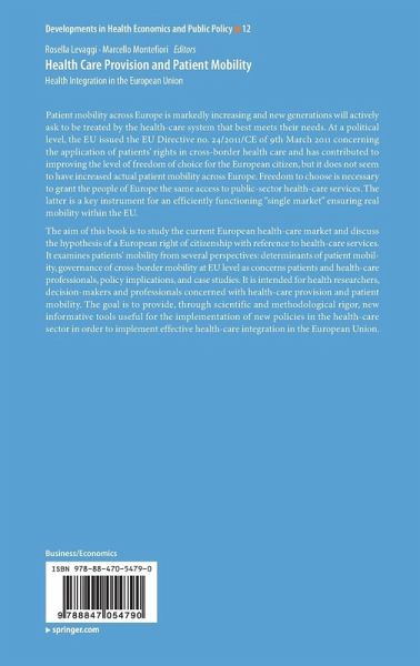 The aim of this book is to study the current European health care market and discuss the hypothesis of a European right of citizenship with reference to health-care services. It examines patients' mobility from several perspectives: determinants of patient mobility, governance of cross-border mobility at EU level as concerns patients and health-care professionals, policy implications, and case studies. It is intended for health researchers, decision-makers and professionals concerned with health-care provision and patient mobility. The goal is to provide, through scientific and methodological rigor, new informative tools useful for the implementation of new policies in the health-care sector in order to implement effective health-care integration in the European Union.
