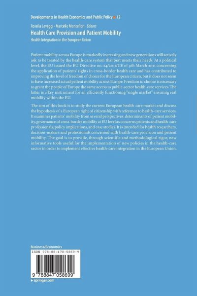 The aim of this book is to study the current European health care market and discuss the hypothesis of a European right of citizenship with reference to health-care services. It examines patients' mobility from several perspectives: determinants of patient mobility, governance of cross-border mobility at EU level as concerns patients and health-care professionals, policy implications, and case studies. It is intended for health researchers, decision-makers and professionals concerned with health-care provision and patient mobility. The goal is to provide, through scientific and methodological rigor, new informative tools useful for the implementation of new policies in the health-care sector in order to implement effective health-care integration in the European Union.