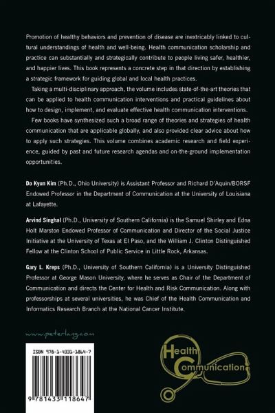 Contents: Do Kyun Kim/Arvind Singhal/Gary Kreps: Introduction: Design, Implementation, and Evaluation of Health Communication Strategies for Global Health Promotion- Charles K. Atkin/Ronald E. Rice: Strategies and Principles for Using Mass and Online/Digital Media in Health Communication Campaigns - Andrew Isham/Bret R. Shaw/Dave Gustafson: Developing and Testing Mobile Health Applications to Affect Behavior Change: Lessons from the Field - Carolyn Lauckner/Pamela Whitten: A Primer for Using Mobile Apps and Social Media in Healthcare - Hua Wang/Arvind Singhal: Digital Games: The SECRET of Alternative Health Realities - Caroline Jacoby/Jane Brown/Uttara Bharath Kumar/Rajiv N. Rimal/Sanjanthi Velu: Entertainment Education Saves Lives and Improves Health: Key Steps to Developing Effective Programs - Wayne A. Beach/Kyle Gutzmer/David M. Dozier/Mary K. Buller/David B. Buller: Conversations about Cancer (CAC): A National and Global Strategy for Impacting Family and Medical Interactions - Tess Thompson/Matthew W. Kreuter: Narrative-based Health Communication Interventions: Using Survivor Stories to Increase Breast Cancer Knowledge and Promote Mammography - Anat Gesser-Edelsburg: Drama as a Rhetorical Health Communication Strategy - Do Kyun Kim/James W. Dearing: Communication Network Analysis for the Diffusion of Health: Identifying Key Individuals - Arvind Singhal: The Positive Deviance Approach to Designing and Implementing Health Communication Interventions - Melinda R. Weathers/Edward Maibach/Matthew Nisbet: Using Theory and Audience Research to Convey the Human Implications of Climate Change - Do Kyun Kim: Integrating the Diffusion of Innovations and Social Marketing for Designing an HIV/AIDS-Prevention Strategy among a Hard-to-Reach Population - Linda Neuhauser/Gary L. Kreps/S. Leonard Syme: Community Participatory Design of Health Communication Interventions - Kari Hartwig: Faith-based Community Health Interventions: Incorporating Cultural Ecology, the Social Ecological Framework, and Gender Analysis - Do Kyun Kim: Designing Logos for Health Campaigns: Convergence of Semiotics and the Diffusion of Innovations - Gary L. Kreps: Strategic Communication for Health Advocacy and Social Change - Mohan J. Dutta: Health Activism as Resistance: MOSOP as a Site of Culture-Centered Resistance in Niger Delta Region of Nigeria - Bradford W. Hesse/David E. Nelson/Richard P. Moser/Kelly D. Blake/Wen-ying Sylvia Chou/Lila J Finney/Ellen Burke Beckjord: National Health Communication Surveillance Systems - Laurel J. Felt/Lucía Durá/Arvind Singhal: Cultural Beacons in Health Communication: Leveraging Overlooked Indicators and Grassroots Wisdoms - Gary L. Kreps: Evaluating Health Communication Interventions.