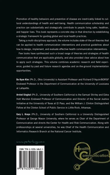 Contents: Do Kyun Kim/Arvind Singhal/Gary Kreps: Introduction: Design, Implementation, and Evaluation of Health Communication Strategies for Global Health Promotion- Charles K. Atkin/Ronald E. Rice: Strategies and Principles for Using Mass and Online/Digital Media in Health Communication Campaigns - Andrew Isham/Bret R. Shaw/Dave Gustafson: Developing and Testing Mobile Health Applications to Affect Behavior Change: Lessons from the Field - Carolyn Lauckner/Pamela Whitten: A Primer for Using Mobile Apps and Social Media in Healthcare - Hua Wang/Arvind Singhal: Digital Games: The SECRET of Alternative Health Realities - Caroline Jacoby/Jane Brown/Uttara Bharath Kumar/Rajiv N. Rimal/Sanjanthi Velu: Entertainment Education Saves Lives and Improves Health: Key Steps to Developing Effective Programs - Wayne A. Beach/Kyle Gutzmer/David M. Dozier/Mary K. Buller/David B. Buller: Conversations about Cancer (CAC): A National and Global Strategy for Impacting Family and Medical Interactions - Tess Thompson/Matthew W. Kreuter: Narrative-based Health Communication Interventions: Using Survivor Stories to Increase Breast Cancer Knowledge and Promote Mammography - Anat Gesser-Edelsburg: Drama as a Rhetorical Health Communication Strategy - Do Kyun Kim/James W. Dearing: Communication Network Analysis for the Diffusion of Health: Identifying Key Individuals - Arvind Singhal: The Positive Deviance Approach to Designing and Implementing Health Communication Interventions - Melinda R. Weathers/Edward Maibach/Matthew Nisbet: Using Theory and Audience Research to Convey the Human Implications of Climate Change - Do Kyun Kim: Integrating the Diffusion of Innovations and Social Marketing for Designing an HIV/AIDS-Prevention Strategy among a Hard-to-Reach Population - Linda Neuhauser/Gary L. Kreps/S. Leonard Syme: Community Participatory Design of Health Communication Interventions - Kari Hartwig: Faith-based Community Health Interventions: Incorporating Cultural Ecology, the Social Ecological Framework, and Gender Analysis - Do Kyun Kim: Designing Logos for Health Campaigns: Convergence of Semiotics and the Diffusion of Innovations - Gary L. Kreps: Strategic Communication for Health Advocacy and Social Change - Mohan J. Dutta: Health Activism as Resistance: MOSOP as a Site of Culture-Centered Resistance in Niger Delta Region of Nigeria - Bradford W. Hesse/David E. Nelson/Richard P. Moser/Kelly D. Blake/Wen-ying Sylvia Chou/Lila J Finney/Ellen Burke Beckjord: National Health Communication Surveillance Systems - Laurel J. Felt/Lucía Durá/Arvind Singhal: Cultural Beacons in Health Communication: Leveraging Overlooked Indicators and Grassroots Wisdoms - Gary L. Kreps: Evaluating Health Communication Interventions.