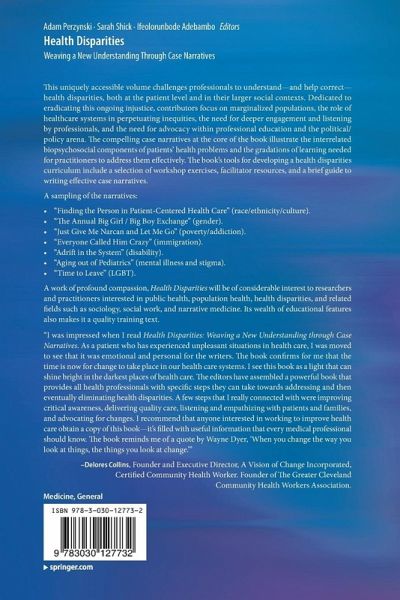 This uniquely accessible volume challenges professionals to understand-and help correct-health disparities, both at the patient level and in their larger social contexts. Dedicated to eradicating this ongoing injustice, contributors focus on marginalized populations, the role of healthcare systems in perpetuating inequities, the need for deeper engagement and listening by professionals, and the need for advocacy within professional education and the political/policy arena. The compelling case narratives at the core of the book illustrate the interrelated biopsychosocial components of patients' health problems and the gradations of learning needed for practitioners to address them effectively. The book's tools for developing a health disparities curriculum include a selection of workshop exercises, facilitator resources, and a brief guide to writing effective case narratives.