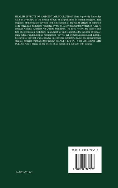 Health Effects of Ambient Air Pollution provides the reader with an overview of the health effects of air pollution in human subjects. The majority of the book is devoted to the discussion of the health effects of common widespread air pollutants regulated by the U.S. Environmental Protection Agency through national ambient air quality standards. The book reviews the sources and fate of common air pollutants in ambient air and researches the adverse effects of these outdoor and indoor air pollutants in `in vivo' cell systems, animals, and humans. Research for the book was conducted in controlled laboratory studies and epidemiologic studies. Special emphasis throughout Health Effects of Ambient Air Pollution is placed on the effects of air pollution in subjects with asthma.