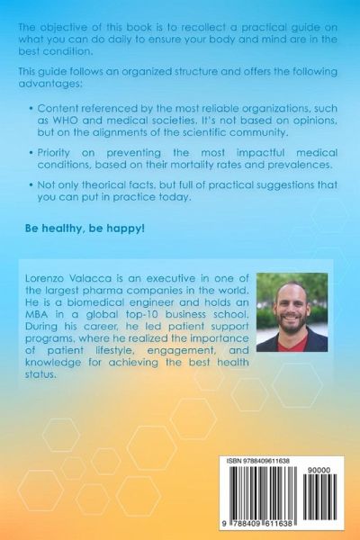 Health is one of the most precious things we have, if not the most. Until we have health problems, we might not give it the deserved consideration, taking it for granted. What if, instead, you start by paying the right attention to it now? Our healthy habits have a greater impact if we start working on them from the early beginning, and this is the central idea of the book on health prevention. Not only is a longer life expectancy desired, but so is an improved quality of life, which is the most fundamental difference between healthspan and lifespan. The objective of this book is to recollect a practical guide on what you can do daily to ensure your body and mind are in the best condition. This guide follows an organized structure and offers the following advantages: ¿ Priority on preventing the most impactful medical conditions, based on their prevalence and mortality rates. ¿ Content referenced by the most reliable organizations, such as WHO and medical societies, based the most updated publications. It's not based on opinions, but on the alignments of the scientific community. ¿ Not theorical facts, but practical suggestions that you can put in practice today. Be healthy, be happy!