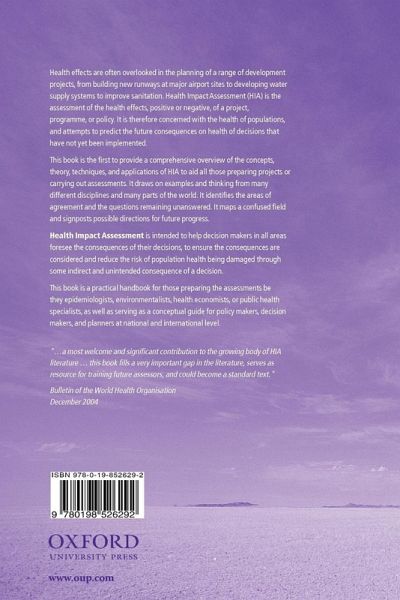 Health effects are often overlooked when planning development projects ranging from new runways at major airport sites to developing water supply systems to improve sanitation. Health Impact Assessment (HIA) is the assessment of the health effects, positive or negative, of a project, programme, or policy. It is therefore concerned with the health of populations and attempts to predict the future consequences for health of decisions which have not yet been implemented. HIA is a new and growing field with numerous schools of thought and areas of controversy. This book is the first to give a comprehensive overview of the concepts, theory, techniques and applications of HIA to aid all those preparing projects or carrying out assessments. It draws on examples and thinking from many different disciplines and many parts of the world. It identifies the areas of agreement and the questions remaining unanswered. It maps a confused field and signposts possible directions for future progress. HIA is intended to help decision makers in all areas foresee the consequences of their decisions, to ensure the consequences are considered and reduce the risk of population health being damaged through some indirect and unintended consequence of a decision. This book is a practical handbook for those preparing the assessments be they epidemiologists, environmentalists, health economists or public health specialists as well as serving as a conceptual guide for policy makers, decision makers and planners at national and international level. This book will serve both as a reference for the established HIA practitioner and as an introduction for the novice.