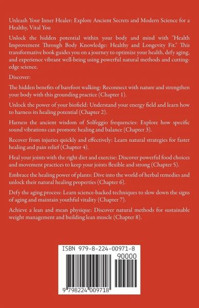 Unleash Your Inner Healer: Explore Ancient Secrets and Modern Science for a Healthy, Vital You Unlock the hidden potential within your body and mind with "Health Improvement Through Body Knowledge: Healthy and Longevity Fit." This transformative book guides you on a journey to optimize your health, defy aging, and experience vibrant well-being using powerful natural methods and cutting-edge science. Discover: The hidden benefits of barefoot walking: Reconnect with nature and strengthen your body with this grounding practice (Chapter 1). Unlock the power of your biofield: Understand your energy field and learn how to harness its healing potential (Chapter 2). Harness the ancient wisdom of Solfeggio frequencies: Explore how specific sound vibrations can promote healing and balance (Chapter 3). Recover from injuries quickly and effectively: Learn natural strategies for faster healing and pain relief (Chapter 4). Heal your joints with the right diet and exercise: Discover powerful food choices and movement practices to keep your joints flexible and strong (Chapter 5). Embrace the healing power of plants: Dive into the world of herbal remedies and unlock their natural healing properties (Chapter 6). Defy the aging process: Learn science-backed techniques to slow down the signs of aging and maintain youthful vitality (Chapter 7). Achieve a lean and mean physique: Discover natural methods for sustainable weight management and building lean muscle (Chapter 8).