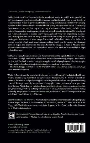In Health in Ruins César Ernesto Abadía-Barrero chronicles the story of El Materno-Colombia's oldest maternity and neonatal health center and teaching hospital-over several decades as it faced constant threats of government shutdown. Using team-based and collaborative ethnography to analyze the social life of neoliberal health policy, Abadía-Barrero details the everyday dynamics around teaching, learning, and working in health care before, during, and after privatization. He argues that health care privatization is not only about defunding public hospitals; it also ruins rich traditions of medical care by denying or destroying ways of practicing medicine that challenge Western medicine. Despite radical cuts in funding and a corrupt and malfunctioning privatized system, El Materno's professors, staff, and students continued to find ways to provide innovative, high-quality, and noncommodified health care. By tracking the violences, conflicts, hopes, and uncertainties that characterized the struggles to keep El Materno open, Abadía-Barrero demonstrates that any study of medical care needs to be embedded in larger political histories.