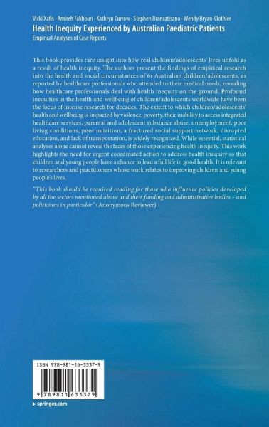This book provides rare insight into how real children/adolescents' lives unfold as a result of health inequity. The authors present the findings of empirical research into the health and social circumstances of 61 Australian children/adolescents, as reported by healthcare professionals who attended to their medical needs, revealing how healthcare professionals deal with health inequity on the ground. Profound inequities in the health and wellbeing of children/adolescents worldwide have been the focus of intense research for decades. The extent to which children/adolescents' health and wellbeing is impacted by violence, poverty, their inability to access integrated healthcare services, parental and adolescent substance abuse, unemployment, poor living conditions, poor nutrition, a fractured social support network, disrupted education, and lack of transportation, is widely recognized. While essential, statistical analyses alone cannot reveal the faces of those experiencing health inequity. This work highlights the need for urgent coordinated action to address health inequity so that children and young people have a chance to lead a full life in good health. It is relevant to researchers and practitioners whose work relates to improving children and young people's lives.