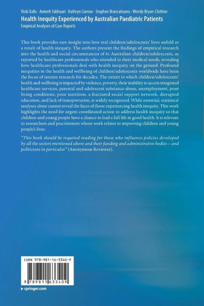 This book provides rare insight into how real children/adolescents' lives unfold as a result of health inequity. The authors present the findings of empirical research into the health and social circumstances of 61 Australian children/adolescents, as reported by healthcare professionals who attended to their medical needs, revealing how healthcare professionals deal with health inequity on the ground. Profound inequities in the health and wellbeing of children/adolescents worldwide have been the focus of intense research for decades. The extent to which children/adolescents' health and wellbeing is impacted by violence, poverty, their inability to access integrated healthcare services, parental and adolescent substance abuse, unemployment, poor living conditions, poor nutrition, a fractured social support network, disrupted education, and lack of transportation, is widely recognized. While essential, statistical analyses alone cannot reveal the faces of those experiencing health inequity. This work highlights the need for urgent coordinated action to address health inequity so that children and young people have a chance to lead a full life in good health. It is relevant to researchers and practitioners whose work relates to improving children and young people's lives.