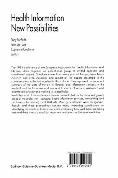 The 1994 conference of the European Association for Health Information and Libraries drew together an exceptional group of invited speakers and contributed papers. Speakers came from every part of Europe, from N. America, and even from Australia, and almost all the papers presented are collected in this volume. They represent an important summary of the state of the art in libraries and information services in the medical and health areas and are a rich source of advice, assistance and information for everyone working in related fields.