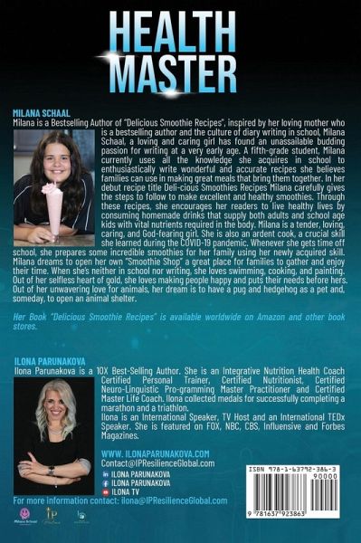 HEALTH MASTER MILANA SCHAAL Milana is a Bestselling Author of "Delicious Smoothie Recipe", inspired by her loving mother who is a bestselling author and the culture of diary writing in school, Milana Schaal, a loving and caring girl has found an unassailable budding passion for writing at a very early age. A fifth-grade student, Milana currently uses all the knowledge she acquires in school to enthusiastically write wonderful and accurate recipes she believes families can use in making great meals that bring them together. In her debut recipe title Deli-cious Smoothies Recipes Milana carefully gives the steps to follow to make excellent and healthy smoothies. Through these recipes, she encourages her readers to live healthy lives by consuming homemade drinks that supply both adults and school age kids with vital nutrients required in the body. Milana is a tender, loving, caring, and God-fearing girl. She is also an ardent cook, a crucial skill she learned during the COVID-19 pandemic. Whenever she gets time off school, she prepares some incredible smoothies for her family using her newly acquired skill. Milana dreams to open her own "Smoothie Shop" a great place for families to gather and enjoy Out of her selfless heart of gold, she loves making people happy and puts their needs before hers. Out of her unwavering love for animals, her dream is to have a pug and hedgehog as a pet and, someday, to open an animal shelter. Her Book "Delicious Smoothie Recipes" is available worldwide on Amazon and other book stores. ILONA PARUNAKOVA Ilona Parunakova is a 10X Best-Selling Author. She is an Integrative Nutrition Health Coach Certified Personal Trainer, Certified Nutritionist, Certified Neuoro-Linguistic Programming Master Practitioner and Certified Master Life Coach. Ilona collected medals for successfully completing a marathon and a triathlon. Ilona is an International Speaker, TV Host and an International TEDx Speaker. She is featured on FOX, NBC, CBS, Influensive and Forbes Magazines. WWW.ILONAPARUNAKOVA.COM Contact@IPResilienceGlobal.com For more information contact: ilona@IPResilienceGlobal.com