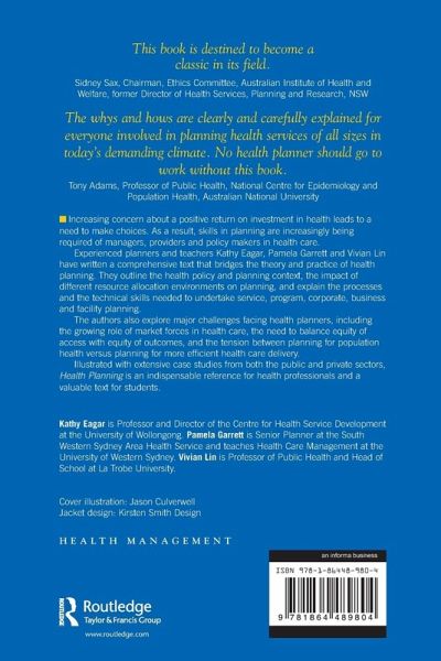This book is destined to become a classic in its field. Sidney Sax, Chairman, Ethics Committee, Australian Institute of Health and Welfare, former Director of Health Services, Planning and Research, NSW The whys and hows are clearly and carefully explained for everyone involved in planning health services of all sizes in today's demanding climate. No health planner should go to work without this book. Tony Adams, Professor of Public Health, National Centre for Epidemiology and Population Health, Australian National University Increasing concern about a positive return on investment in health leads to a need to make choices. As a result, skills in planning are increasingly being required of managers, providers and policy makers in health care. Experienced planners and teachers Kathy Eagar, Pamela Garrett and Vivian Lin have written a comprehensive introduction that bridges the theory and practice of health planning. They outline the health policy and planning context, the impact of different resource allocation environments on planning, and explain the processes and the technical skills needed to undertake service, program, corporate, business and facility planning. The authors also explore major challenges facing health planners, including the growing role of market forces in health care, the need to balance equity of access with equity of outcomes, and the tension between planning for population health versus planning for more efficient health care delivery. Illustrated with extensive case studies from both the public and private sectors, Health Planning is an indispensable reference for health professionals and a valuable text for students.