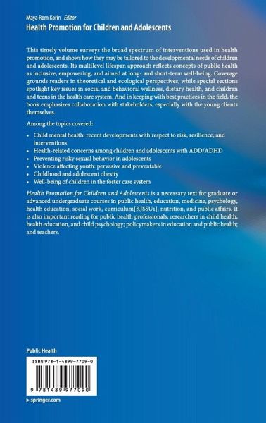 Child mental health: recent developments with respect to risk, resilience, and interventions Health-related concerns among children and adolescents with ADD/ADHD Preventing risky sexual behavior in adolescents Violence affecting youth: pervasive and preventable Childhood and adolescent obesity Well-being of children in the foster care system Health Promotion for Children and Adolescents is a necessary text for graduate or advanced undergraduate courses in public health, education, medicine, psychology, health education, social work, curriculum, nutrition, and public affairs. It is also important reading for public health professionals; researchers in child health, health education, and child psychology; policymakers in education and public health; and teachers.
