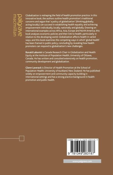 Globalization is reshaping the field of health promotion practice. In this innovative study, the authors outline health promotion's traditional concerns and argue that 'a policy of glocalization' (thinking globally, acting locally) can succeed in establishing health equality and achieving empowerment individually, locally, nationally and globally. Drawing on international examples across Africa, Asia, Europe and North America, this study analyses economic policies and their link to health, particularly in relation to the developing world. Globalization affects health in varied ways and this book examines the competing ways in which 'global health' has been framed in public policy, concluding by revealing how health promoters can respond to globalization's new challenges.