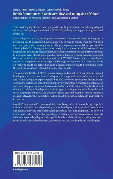 1. Introduction: What do we know about global efforts to promote health among adolescent boys and young men of colour?.- 2. Becoming: An intervention to promote mental wellbeing of young Black men in the United States.- 3. A community-based ecosystems approach for promoting the health, wellbeing and healing of boys and young men of colour.- 4. First-Generation Black college men in the United States and the value of cohort-based programs: Addressing inequities through the YBMen Project.- 5. Situating for success: Lessons learned from the evaluation of the Making Connections place-based mental health initiatives involving boys and men of colour across the United States.- 6. "Where are our men?": How the DUDES Club has supported Indigenous men in British Columbia, Canada to seek a path of healing and wellness.- 7. Coming to know Ishkode: Re-encountering Indigenous male wholistic wellness in Canada.- 8. Exploring the social and cultural determinants of Indigenous males' participation and success in higher education in Australia.- 9. Applying Indigenous Data Sovereignty principles to research with young Indigenous males: Lessons for health promotion from a higher education project in Australia.- 10. La Cultura Cura and El Joven Noble: Culturally rooted theory and practice formulations for healing wounded boys and young men of colour in the United States.- 11. Promoting health and wellbeing: Young Cook Islands Maori men in New Zealand and the Cook Islands.- 12. Promoting cultural identity as a form of health promotion for New Zealand-born Niue men in Aotearoa (New Zealand).- 13. "Been through it too": Exploring community development through collaborative hip-hop creation.- 14. Masculinities and health in justice-involved youth: Implications for boys and young men of colour.- 15. Conclusion: Future directions in global health promotion with young men of colour.