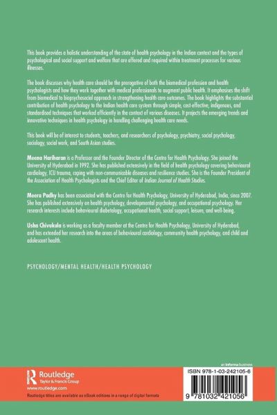 Meena Hariharan is a Professor and the Founder Director of the Centre for Health Psychology. She joined the University of Hyderabad in 1992. She has published extensively in the field of health psychology covering behavioural cardiology, ICU trauma, coping with non-communicable diseases and resilience studies. She is the Founder President of the Association of Health Psychologists and the Chief Editor of Indian Journal of Health Studies. Meera Padhy has been associated with the Centre for Health Psychology, University of Hyderabad, India, since 2007. She has published extensively on health psychology, developmental psychology, and occupational psychology. Her research interests include behavioural diabetology, occupational health, social support, leisure, and well-being. Usha Chivukula is working as a faculty member at the Centre for Health Psychology, University of Hyderabad, and has extended her research into the areas of behavioural cardiology, community health psychology and child and adolescent health.