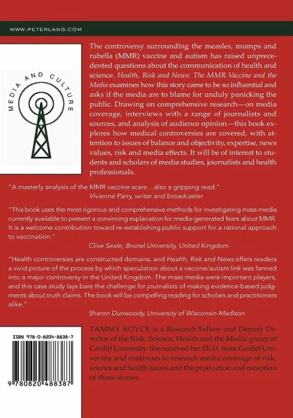 «Health controversies are constructed domains, and 'Health, Risk and News' offers readers a vivid picture of the process by which speculation about a vaccine/autism link was fanned into a major controversy in the United Kingdom. The mass media were important players, and this case study lays bare the challenge for journalists of making evidence-based judgments about truth claims. The book will be compelling reading for scholars and practitioners alike.» (Sharon Dunwoody, University of Wisconsin-Madison)