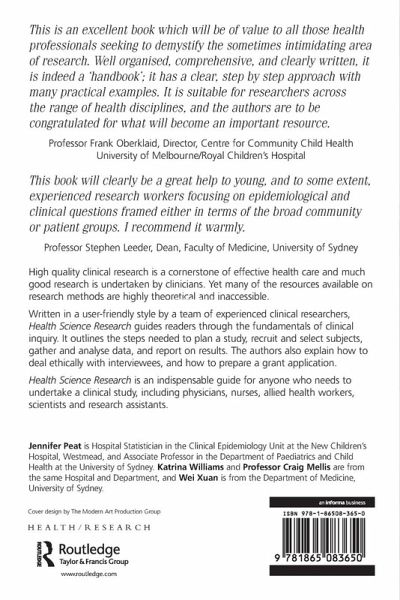 This is an excellent book, which will be of value to all those health professionals seeking to demystify the sometimes intimidating area of research. Well organised, comprehensive, and clearly written, it is indeed a 'handbook'; it has a clear, step by step approach with many practical examples. It is suitable for researchers across the range of health disciplines, and the authors are to be congratulated for what will become an important resource. Professor Frank Oberklaid, Director, Centre for Community Child Health University of Melbourne/Royal Children's Hospital This book will clearly be a great help to young, and to some extent, experienced research workers focusing on epidemiological and clinical questions framed either in terms of the broad community or patient groups. I recommend it warmly. Professor Stephen Leeder, Dean, Faculty of Medicine, University of Sydney High quality clinical research is a cornerstone of effective health care and much good research is undertaken by clinicians. Yet many of the resources available on research methods are highly theoretical and inaccessible. Written in a user-friendly style by a team of experienced clinical researchers, Health Science Research guides readers through the fundamentals of clinical inquiry. It outlines the steps needed to plan a study, recruit and select subjects, gather and analyse data, and report on results. The authors also explain how to deal ethically with interviewees, and how to prepare a grant application. Health Science Research is an indispensable guide for anyone who needs to undertake a clinical study, including physicians, nurses, allied health workers, scientists and research assistants. Jennifer Peat is Hospital Statistician in the Clinical Epidemiology Unit at the New Children's Hospital, Westmead, and Associate Professor in the Department of Paediatrics and Child Health at the University of Sydney. Katrina Williams and Professor Craig Mellis are from the same Hospital and Department, and Wei Xuan is from the Department of Medicine, University of Sydney.