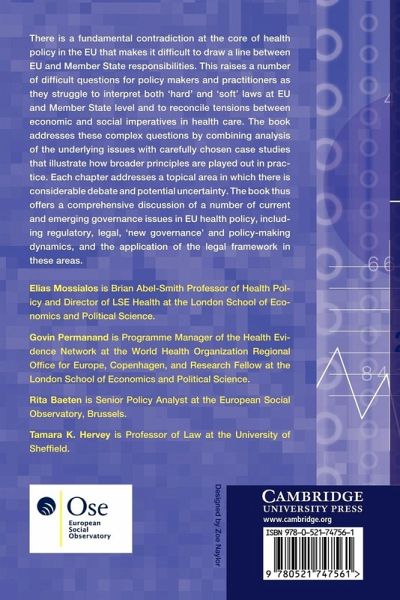 There is a fundamental contradiction at the core of health policy in the EU that makes it difficult to draw a line between EU and Member State responsibilities. This raises a number of difficult questions for policy makers and practitioners as they struggle to interpret both 'hard' and 'soft' laws at EU and Member State level and to reconcile tensions between economic and social imperatives in health care. The book addresses these complex questions by combining analysis of the underlying issues with carefully chosen case studies that illustrate how broader principles are played out in practice. Each chapter addresses a topical area in which there is considerable debate and potential uncertainty. The book thus offers a comprehensive discussion of a number of current and emerging governance issues in EU health policy, including regulatory, legal, 'new governance' and policy-making dynamics, and the application of the legal framework in these areas. There is a fundamental contradiction at the core of health policy in the EU that makes it difficult to draw a line between EU and Member State responsibilities. This book thus offers a comprehensive discussion of a number of current and emerging governance issues in EU health policy.