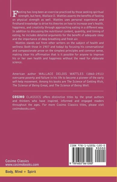 Fasting has long been an exercise practiced by those seeking spiritual strength, but here, Wallace D. Wattles asserts the benefits of fasting on physical strength as well. Wattles uses personal experience and firsthand knowledge to drive his theories on how to increase one's health, happiness, and creativity through approaching eating in a different way. In addition to discussing the nutritional content, quantity, and timing of eating, he includes detailed arguments for the benefit of adequate sleep and the importance of deep breathing and fresh air. Wattles stands out from other writers on the subject of health and wellness (both those in 1907 and today) by focusing his conversational and compassionate prose on the simplest principles and common sense, making clear his affirmation that is it possible for anyone to improve his or her own health and happiness without the need for elaborate science. American author WALLACE DELOIS WATTLES (1860-1911) overcame poverty and failure in his life to become a pioneer of the early self-help movement. Among his books are The Science of Getting Rich, The Science of Being Great, and The Science of Being Well.