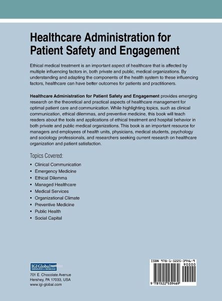 Ethical medical treatment is an important aspect of healthcare that is affected by multiple influencing factors in, both private and public, medical organizations. By understanding and adapting the components of the health system to these influencing factors, healthcare can have better outcomes for patients and practitioners. Healthcare Administration for Patient Safety and Engagement provides emerging research on the theoretical and practical aspects of healthcare management for optimal patient care and communication. While highlighting topics, such as clinical communication, ethical dilemmas, and preventive medicine, this book will teach readers about the tools and applications of ethical treatment and hospital behavior in both private and public medical organizations. This book is an important resource for managers and employees of health units, physicians, medical students, psychology and sociology professionals, and researchers seeking current research on healthcare organization and patient satisfaction.